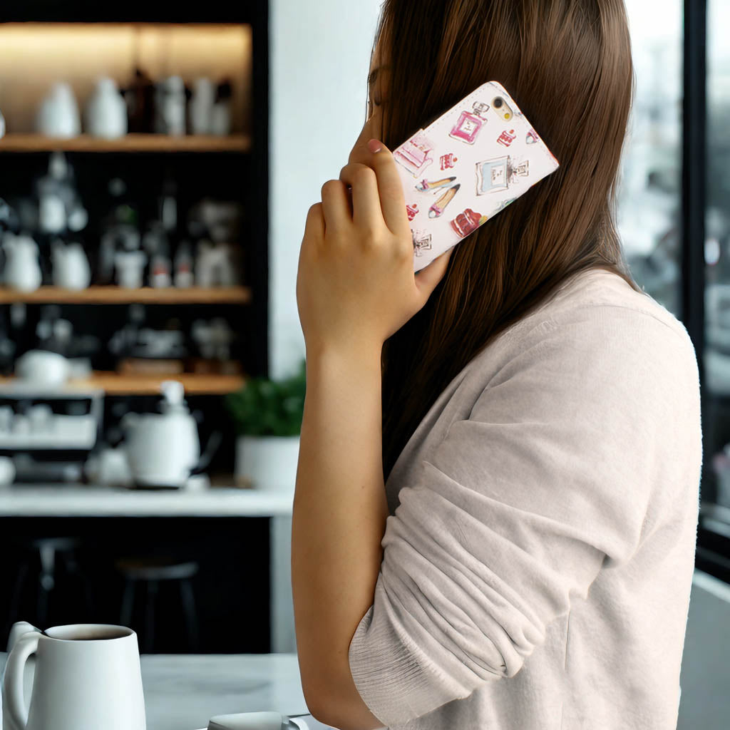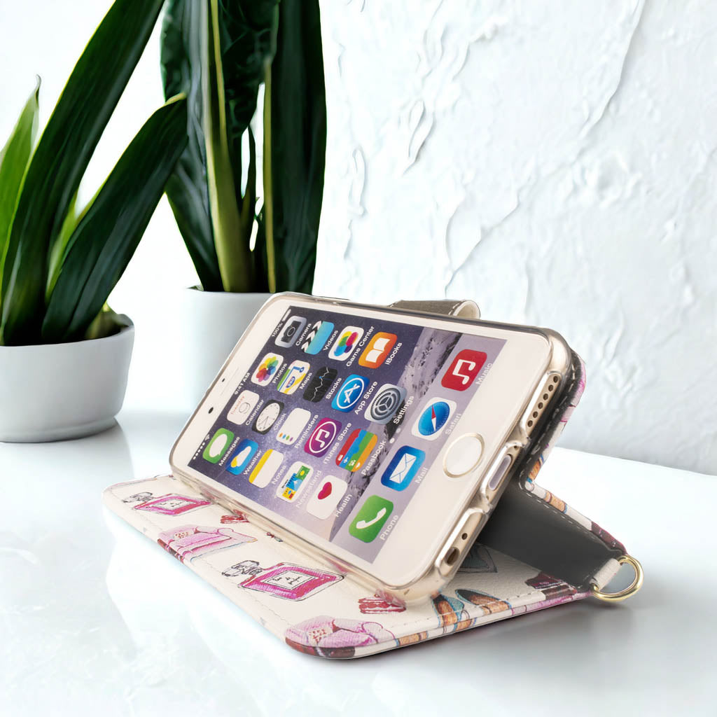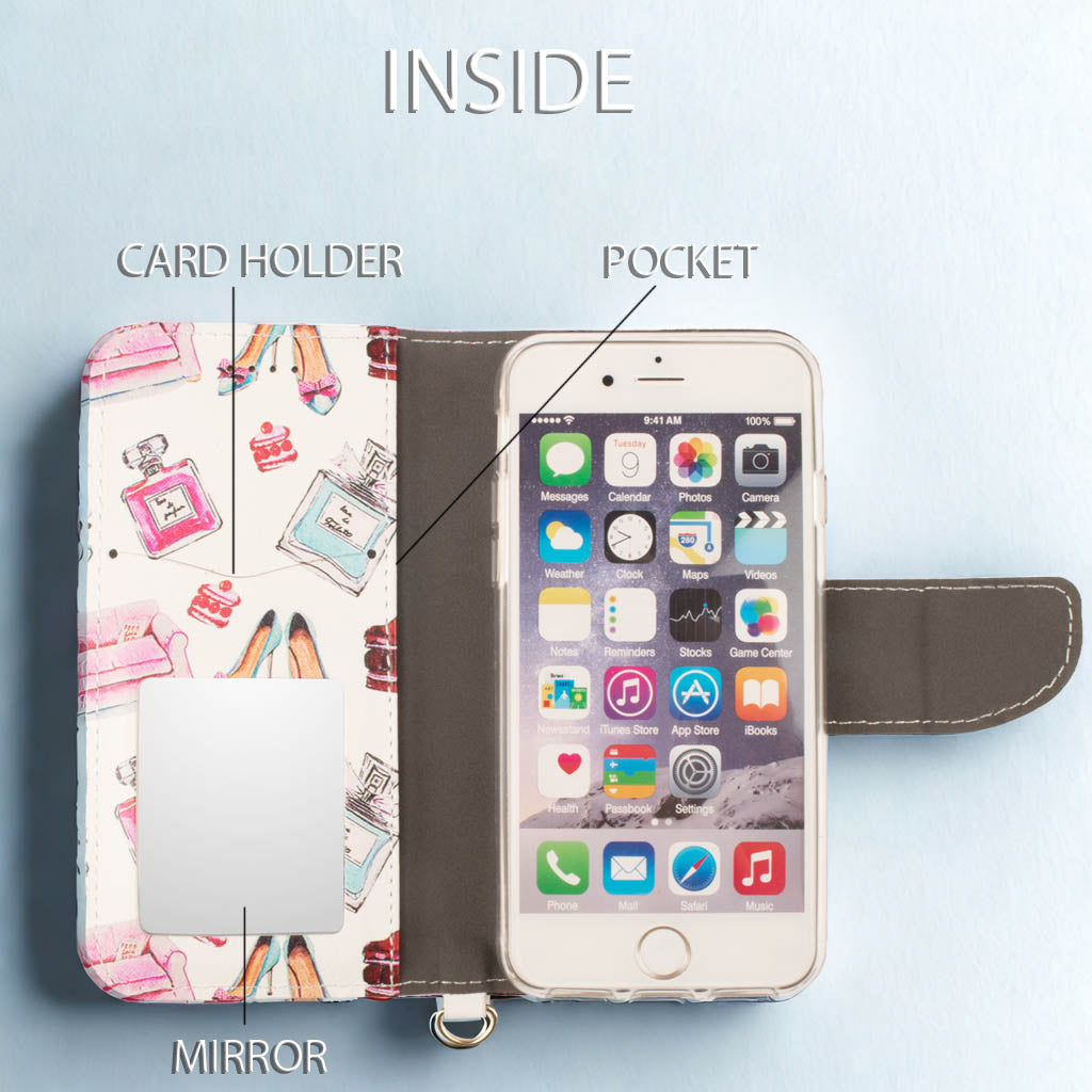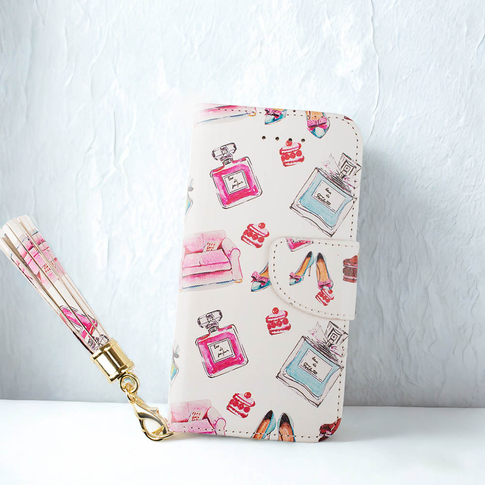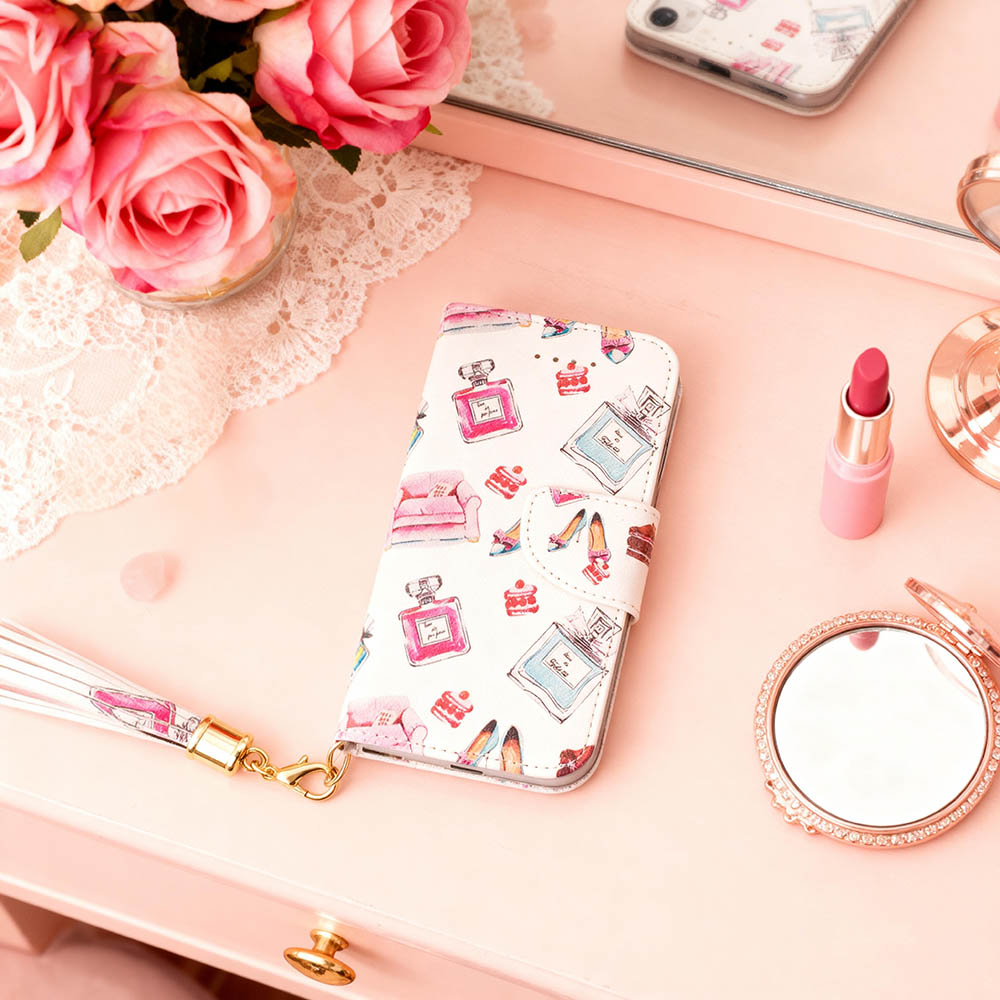 便利なミラー&ストラップ&ポケット付き♪ 大人かわいいハイヒール×パフューム×ケーキ×ソファ柄のスマホケース 仕事にもプライベートでもご使用いただける白色